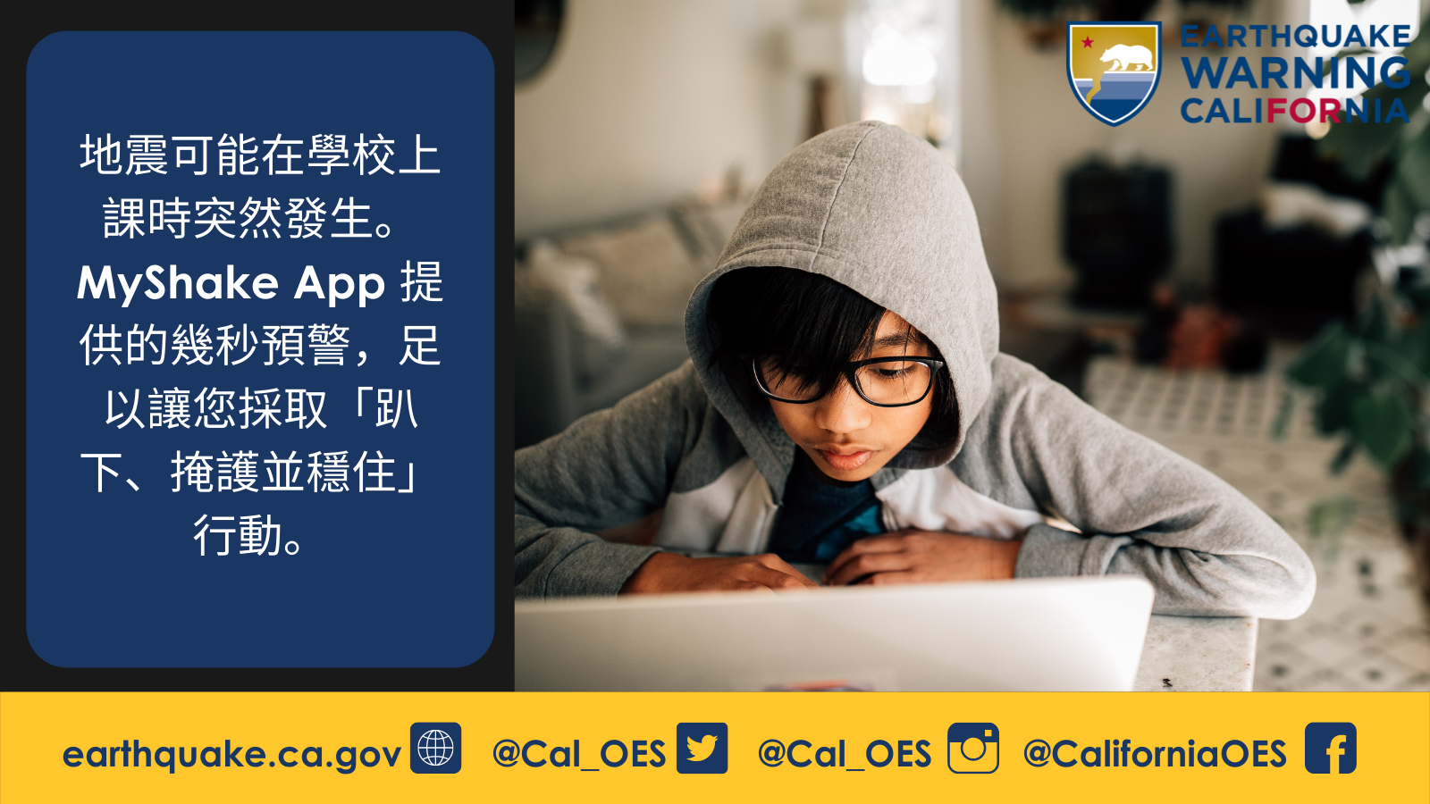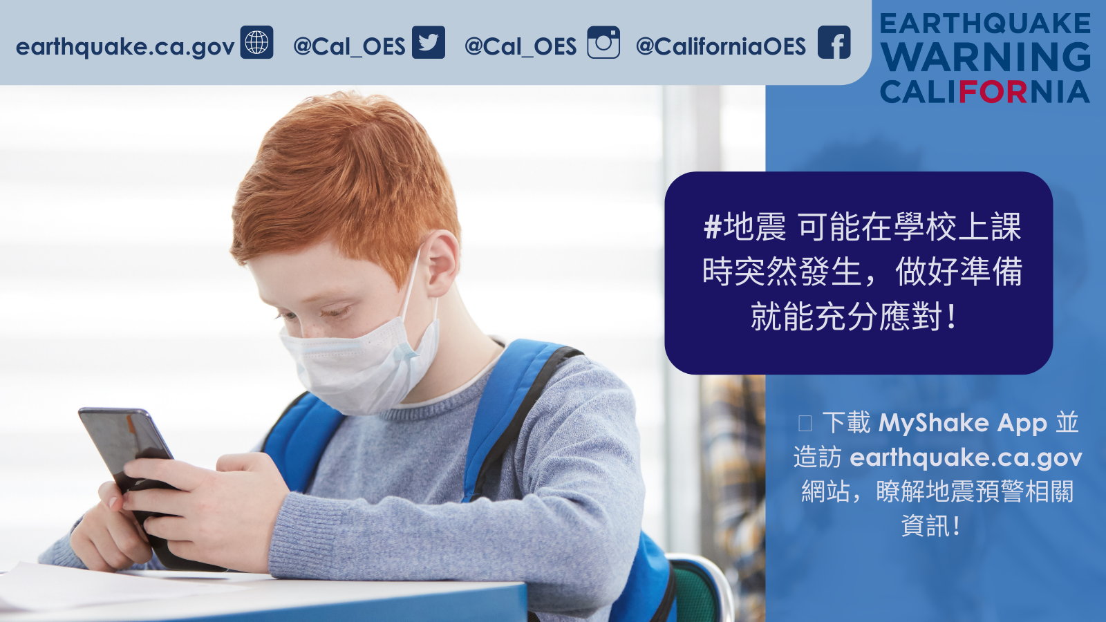- 今年秋天, [填入學校名稱]很開心能參加 10 月 21 日舉行的 Great #California #ShakeOut 演習! 請確保您的手機能收到 #地震 預警! 從 Apple App Store 或 Google Play 下載 #MyShakeApp。