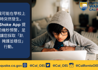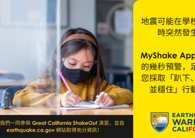 Cal OES 也鼓勵學校參與 2021 年 10 月 21 日舉辦的年度 Great California ShakeOut 演習。 做為地震演習的一部分,Cal OES 鼓勵民眾下載和使用免費的 MyShake App。