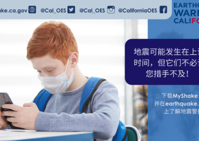 如需了解关于Earthquake Warning California、MyShake App或其他地震预警资源的更多信息,请访问 earthquake.ca.gov。