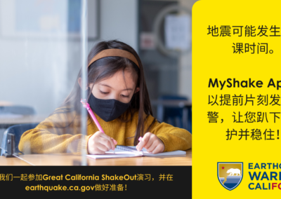 Cal OES还鼓励学校参加将于2021年10月21日举行的一年一度的Great California ShakeOut演习。 作为地震演习的一部分,Cal OES 鼓励公众下载并启用免费的MyShake App。