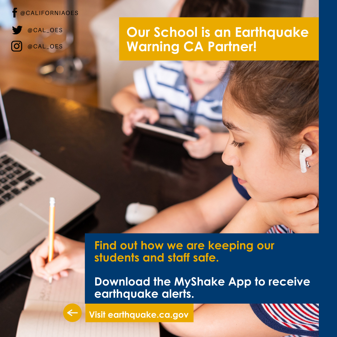 - [Insert School Name] is proud to be a #EarthquakeWarningCA partner and find additional ways to keep our students and staff safe in the event of an #earthquake.